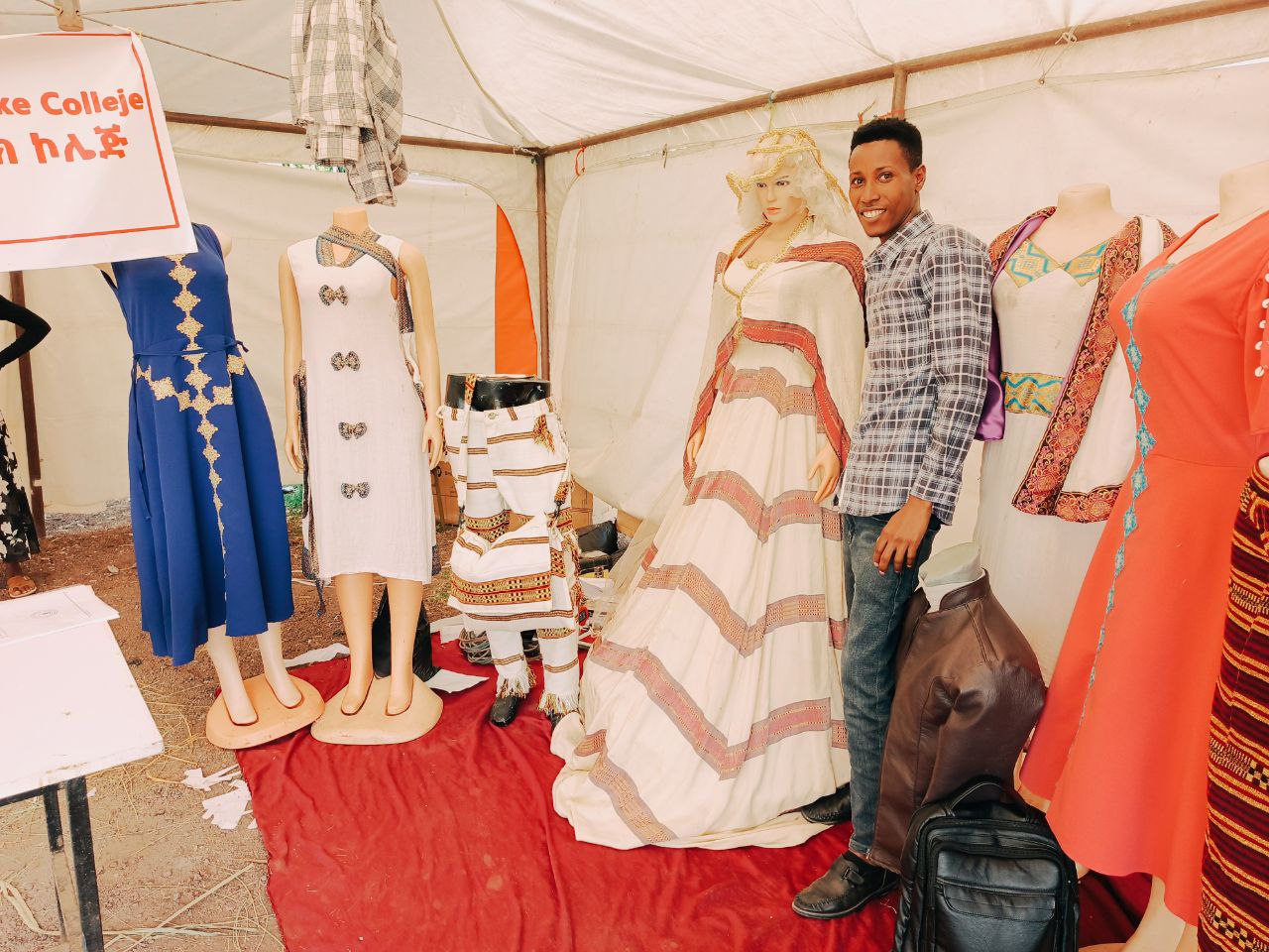garment technology innovations at Daye Polytechnic College, featuring a vibrant display of culturally inspired clothing designs. The garments, displayed on mannequins, highlight a blend of traditional...